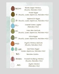 Here is a digital identification chart for your hatching eggs! You can use this to identify what each egg is in the clutch you purchased, and what color the offspring will lay. This is helpful because I breed designer hybrids so the color of the eggs you receive aren't always reflective of the egg color your chicks from them will lay.